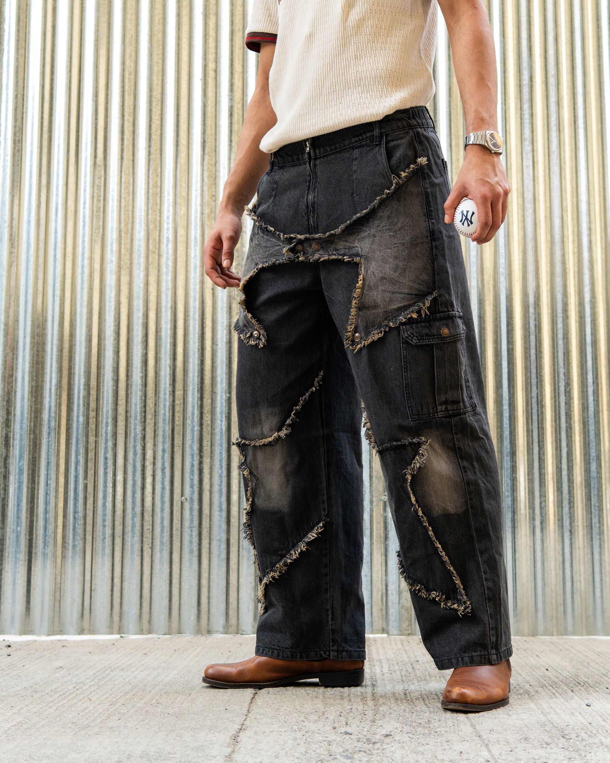 Rebel Layer Denim features a relaxed, wide-leg fit with a layered distressed panel construction designed for elevated everyday streetwear.